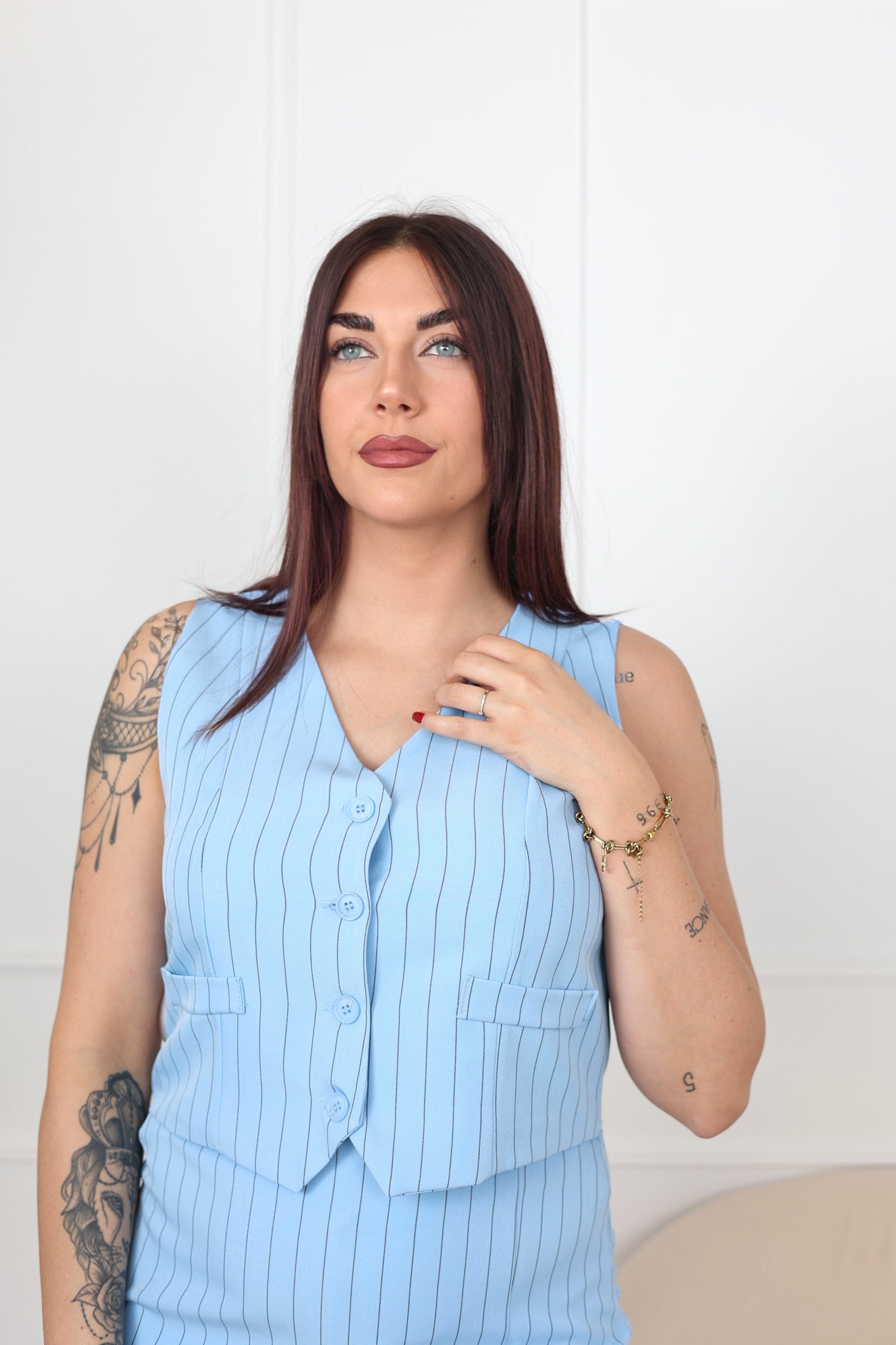 Le gilet AYLINE, avec ses rayures élégantes, offre une versatilité remarquable. Portez-le en solo pour une silhouette minimaliste, ou associez-le à sa veste coordonnée, son pantalon ou sa jupe-short pour des compositions raffinées. Une pièce incontournable qui s'adapte à vos envies de style.