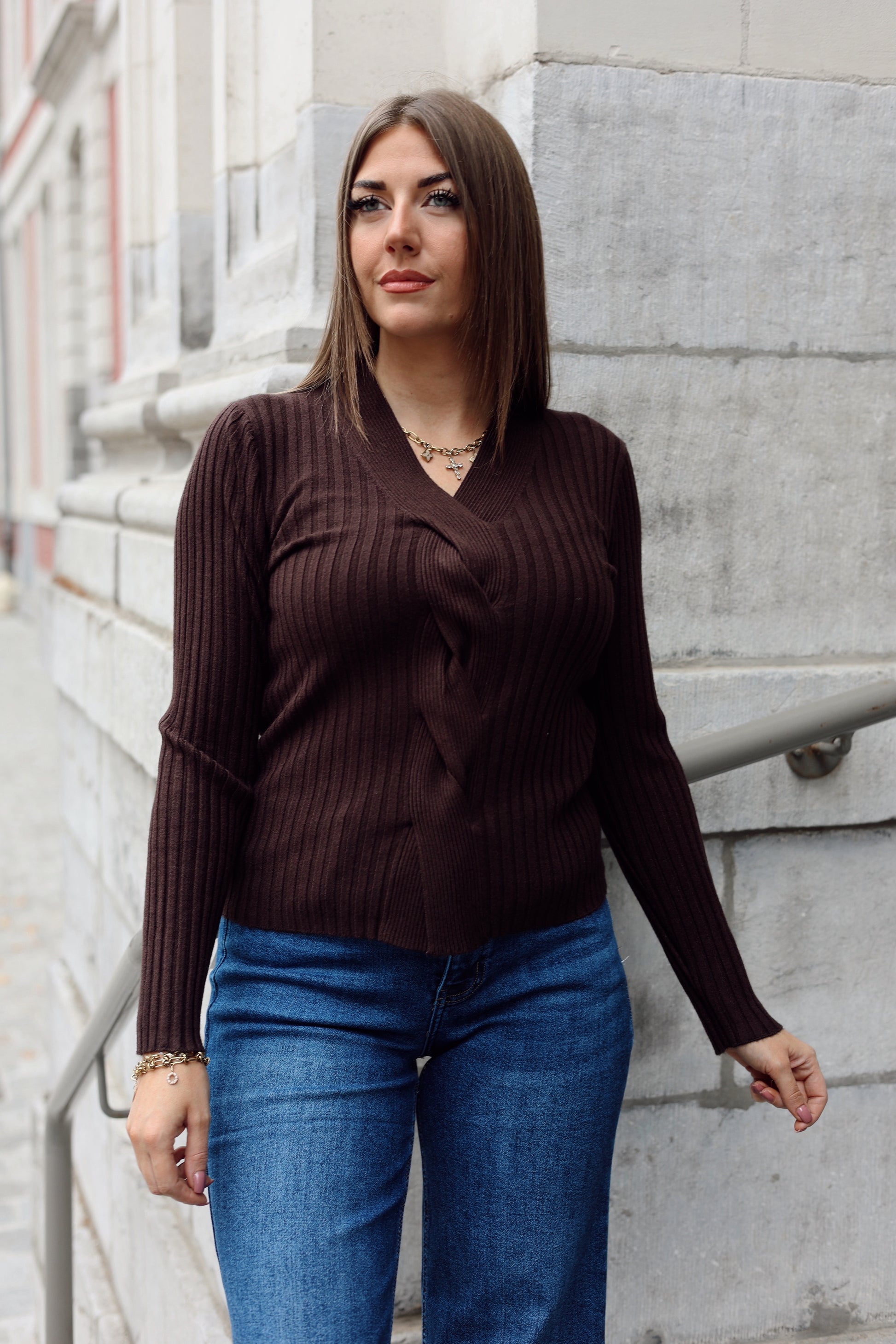 Le pull LETITIA séduira par sa coupe épurée et son mini col en V élégant. Son détail de croisement sur le devant crée une silhouette flatteuse et sophistiquée.