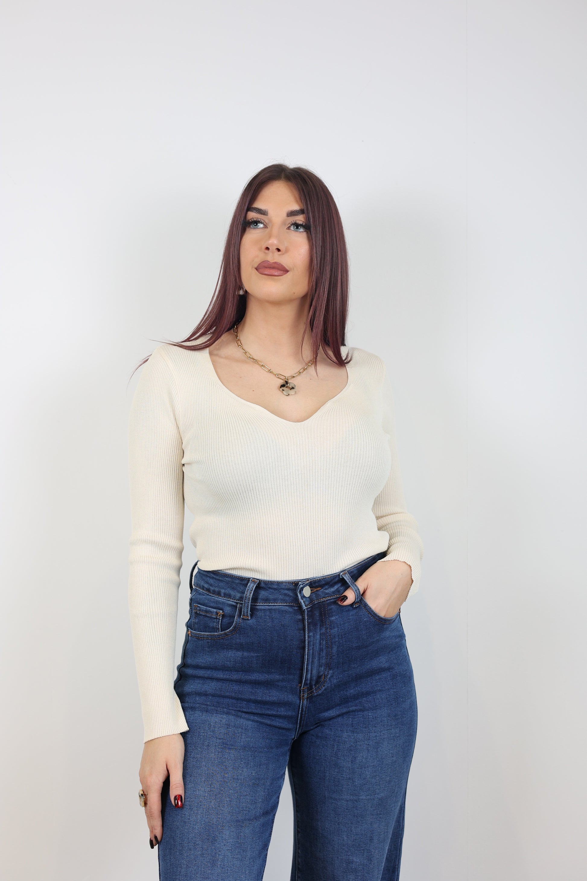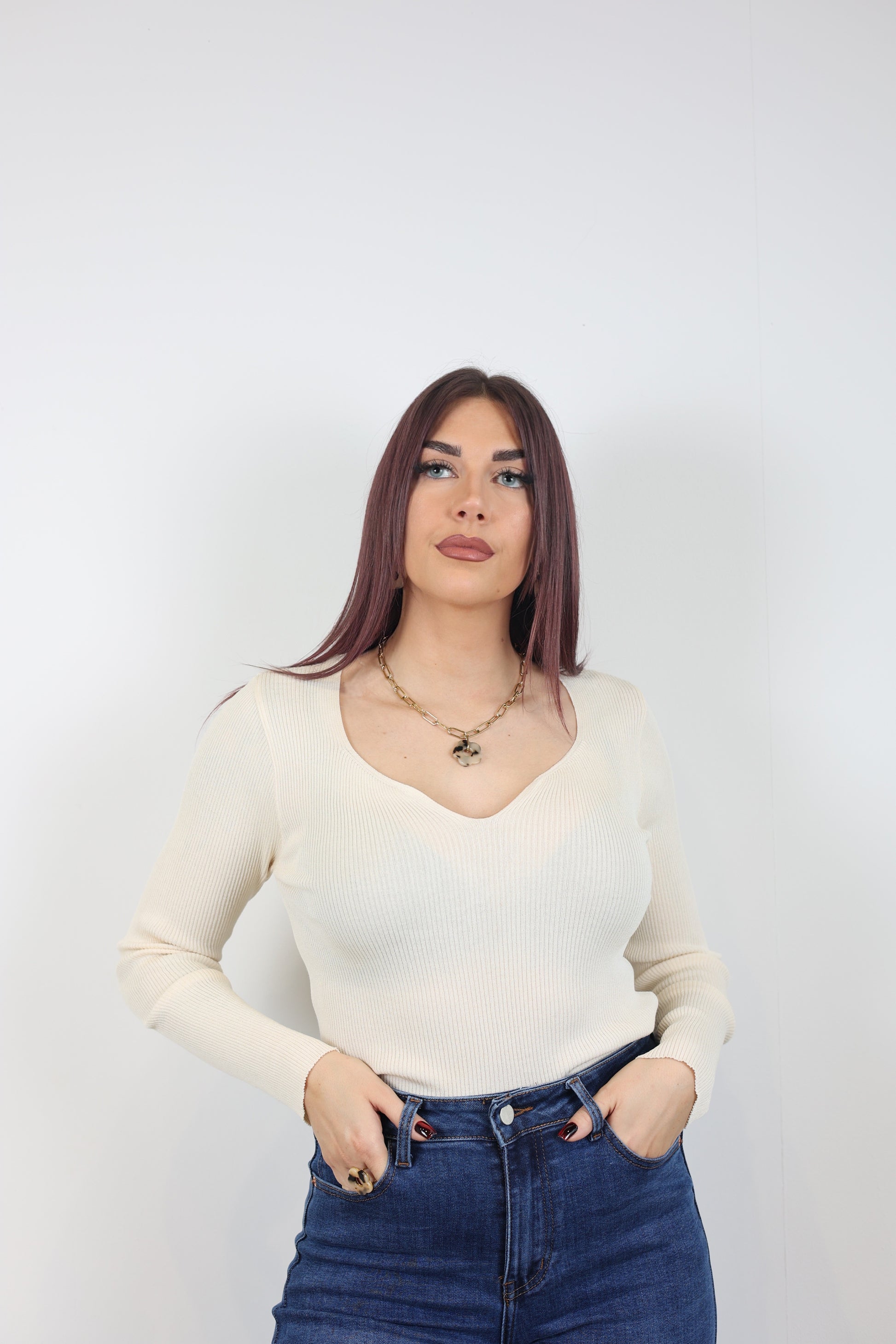 Le top TRINE a une matière chaleureuse qui est inspirée d'un pull. Elle conserve une légèreté remarquable. Son col en V discret crée une ligne flatteuse qui sublime votre silhouette. Parfait pour les superpositions, ce basique incontournable se glisse sans effort sous une veste ou un manteau, offrant la chaleur nécessaire sans surcharge.